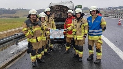 Kameraden der Feuerwehr retten Paket ihrer Kollegen