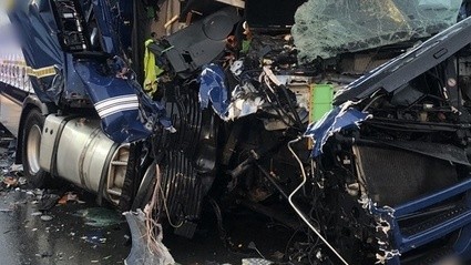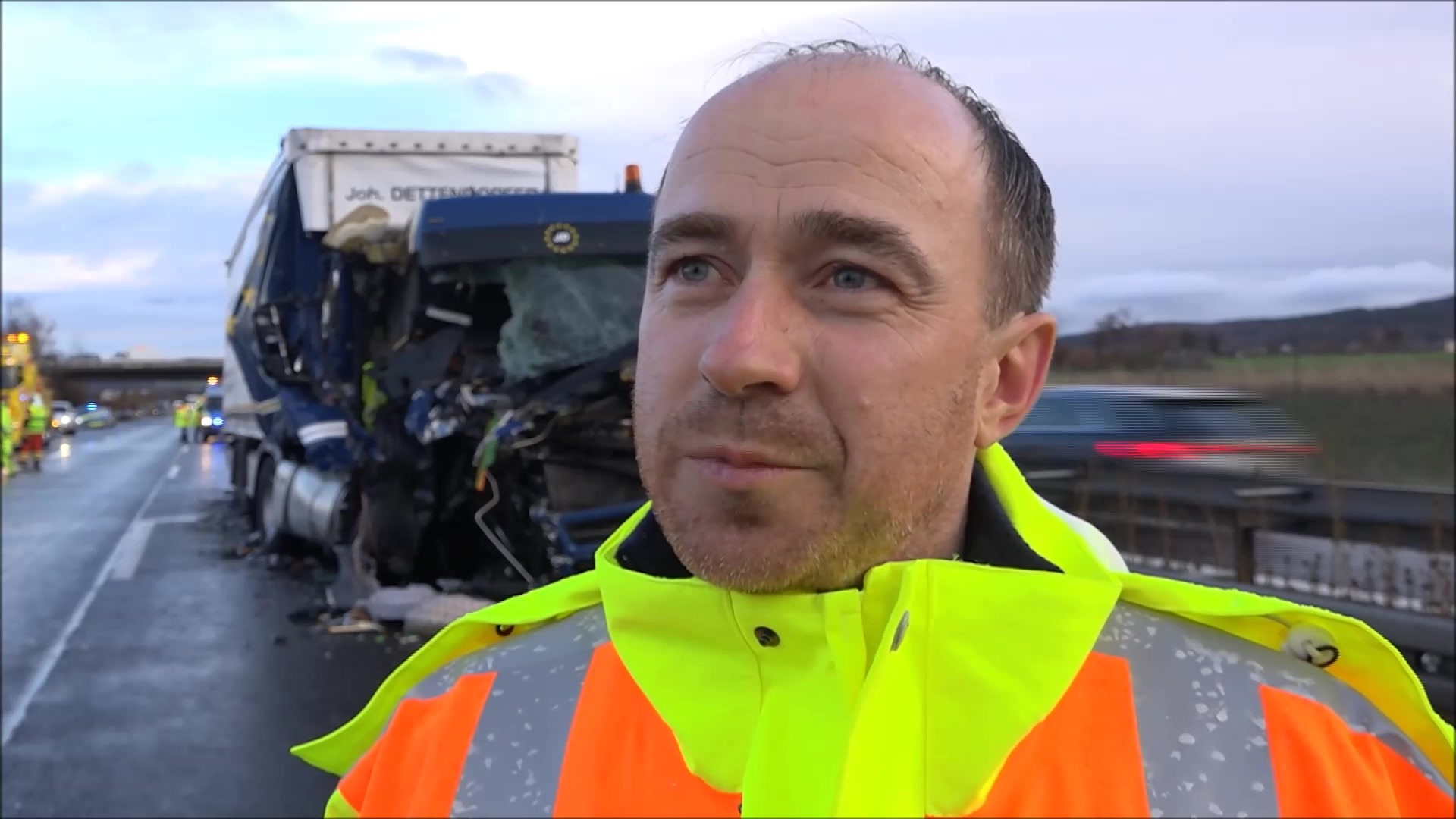 Bei Starkregen und entsprechend nasser Straße war zunächst ein Pkw bei einem Bremsmanöver ins Schleudern geraten und hatte sich auf der Fahrbahn gedreht. Zwei nachfolgende Fahrer von schweren Lkw erkannten die Situation rechtzeitig und bremsten ihre Trucks bis zum Stillstand ab. Ein weiterer nachfolgender 40-Tonner konnte nicht mehr bremsen und fuhr auf die beiden stehenden Lkw auf. Dabei wurde nahezu das gesamte Führerhaus zerstört. Der 32 Jahre alte Fahrer hatte einen Schutzengel und wurde mit lediglich oberflächlichen Verletzungen in ein Krankenhaus gebracht.
