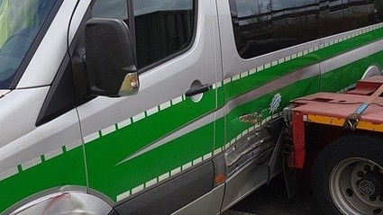 Zu einer Kontrolle hatten die Beamten mit ihrem uniformierten Mercedes Sprinter an der Zufahrt zur Schwerverkehrsspur der Rastanlage angehalten. Während die Polizisten im Fahrzeuginneren arbeiteten, machte sich der über 100 m entfernt abgestellte 14-achsiche Tiefladen einer Schwertransportfirma selbstständig und rollte auf das Polizeifahrzeug zu.