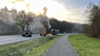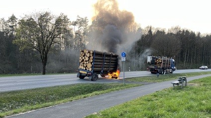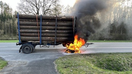 Auf seiner Fahrt bemerkte der 30-Jährige plötzlich einen Reifenplatzer am Anhänger seines Holztransporters. Kurz darauf brannte der vordere rechte Reifen des Anhängers lichterloh. Zusammen mit einem zufällig vorbeifahrenden Waldarbeiter konnte er den Anhänger von der Zugmaschine abkoppeln und so verhindern, dass die Flammen auf die Zugmaschine übergreifen.