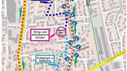 Am Joseph-Otto-Platz (pinke Markierung) gibt es eine sogenannte „Kiss & Go“-Zone: Eltern, die ihre Kinder mit dem Auto zur Schule bringen, werden dringend aufgefordert, ihre Kinder hier aussteigen zu lassen, um eine Staubildung im Baustellenverkehr zu vermeiden. Der oben beschriebene, rund 200 Meter lange Fußweg zur Schule ist gesichert und auch für junge Schüler laut Stadtverwaltung zumutbar. Von einer direkten Anfahrt mit dem Pkw in das Schulzentrum in der Pestalozzistraße in Richtung Norden über die Bammersdorfer Straße wird aus Sicherheitsgründen von Seiten der Behörde dringend abgeraten, auch da in der Bammersdorfer Straße nicht gehalten werden darf.