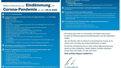 Ministerpräsident Söder unterstützte unterdessen den von der Nationalen Wissenschaftsakademie Leopoldina geforderten harten Lockdown. Hierbei würde es unter anderem zu Geschäftsschließungen ab Weihnachten kommen. Sofern sich die Ministerpräsidentenkonferenz auf diesen Schritt einigen würde, werde Bayern die Maßnahme mittragen, so der Ministerpräsident bei seiner gestrigen Regierungserklärung im Landtag.