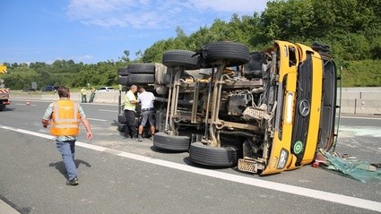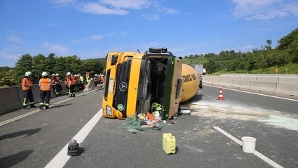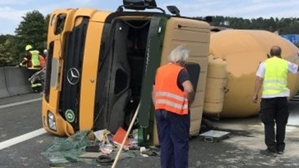 Ein umgestürzter Betonmischer war Auslöser für lange Staus und zwei Unfalle am Stauende. Durch einen geplatzten rechten Vorderreifen kam am Dienstagnachmittag ein mit sechs Kubikmeter Beton vollbeladener Betonmischer aus Thüringen auf der Gefällstrecke des Bindlacher Berges ins Schleudern und stürzte quer auf die Fahrbahn. Der 38-jährige Fahrer aus Sandershausen zog sich leichte Verletzungen zu und musste ins Krankenhaus eingeliefert werden. Da das Wrack zwei Fahrspuren blockierte bildete sich innerhalb kurzer Zeit ein mehrere Kilometer langer Stau in Richtung Süden. Zur Bergung und Reinigung der Fahrbahn durch die angrenzenden Feuerwehren musste die Autobahn zeitweise total gesperrt werden. Es entstand ein Schaden von etwa 70000 Euro. Am Stauende ereigneten sich zwei Folgeunfälle. Zunächst fuhr ein 23-jähriger Autofahrer aus Naila auf zwei vorausfahrende Fahrzeuge auf. Vier Fahrzeuginsassen wurden hierbei leicht verletzt, der Sachschaden beträgt 20000 Euro. Die Fahrzeuge mussten abgeschleppt werden. Fast zur gleichen Zeit konnte eine 66-jährige Berlinerin nicht rechtzeitig bremsen und fuhr auf einen vorausfahrenden Opel auf. Hier blieben die Insassen unverletzt und der Schaden 1000 Euro gering.