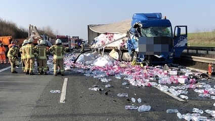 Erst im letzten Moment lenkte er seinen 40-Tonner nach links. Mit der rechten Fahrzeugfront schlug das mit Getränken beladene Gefährt allerdings an dem Warnleit-Lkw der Autobahnmeisterei ein. Dabei riss die Plane auf der rechten Seite auf und die Getränkeflaschen verteilten sich über die gesamten drei Spuren der Fahrbahn.
