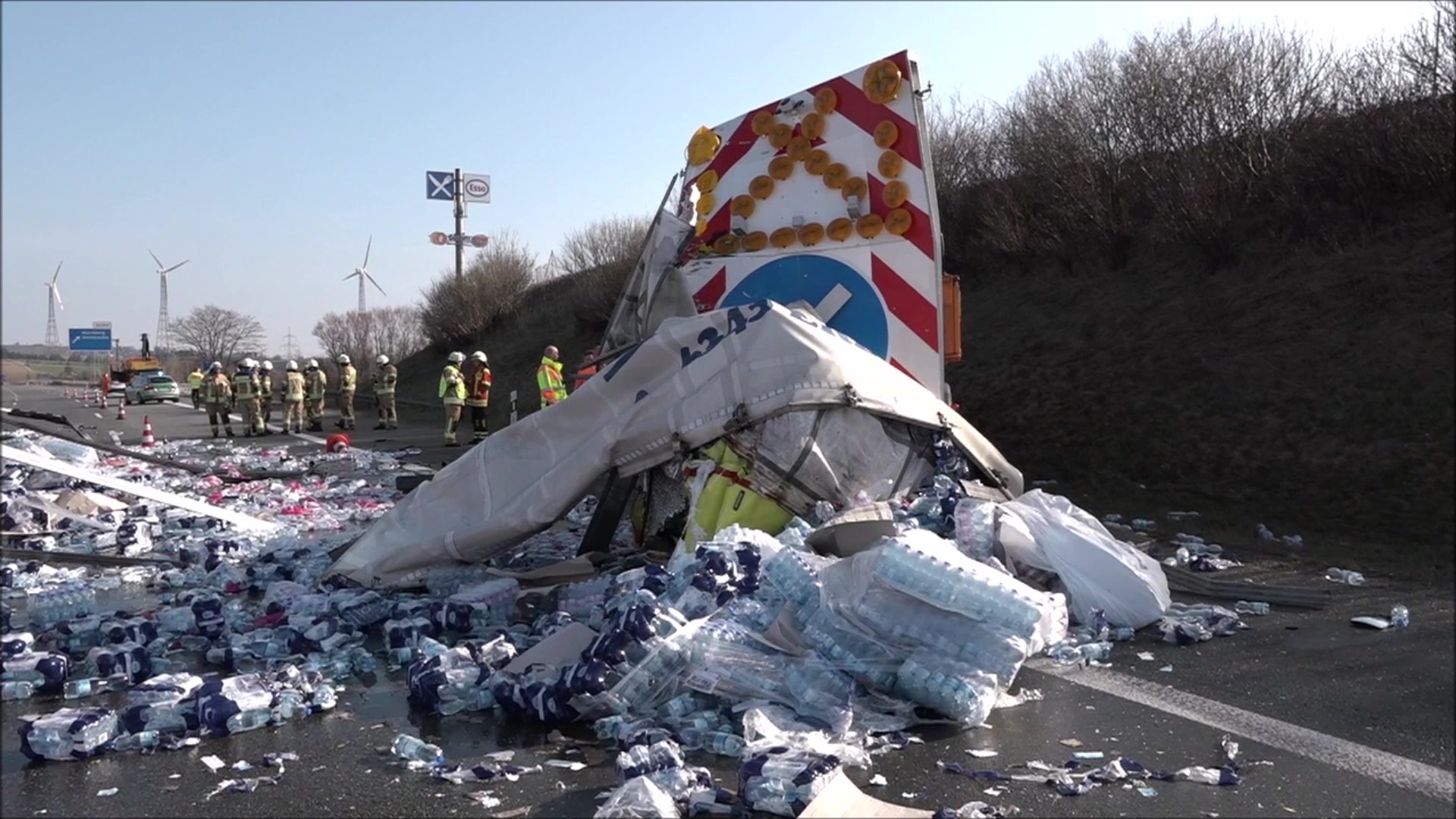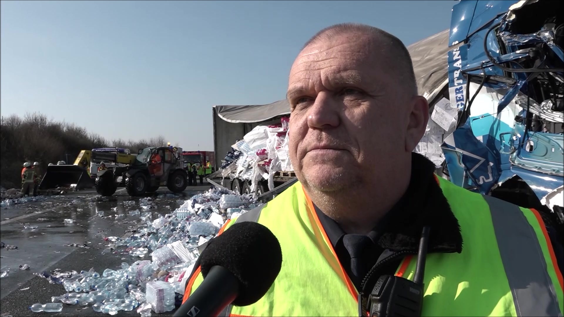 Im Anschluss verteilte sich die gesamte Ladung, Paletten beladen mit 1,5 liter Wasserflaschen, über alle Fahrbahnen in Richtung Norden. Der Fahrer wurde durch die Wucht des Aufpralls am Kopf verletzt. Eine Übermüdung des Fahrers, als Ursache für den Unfall, schließt die Polizei laut Statement derzeit aus, da der Fahrer seine Pause 20 Minuten vor dem Unfall vollzog.