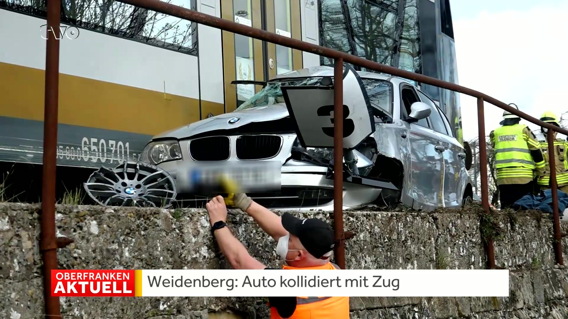 Ein Verkehrsunfall mit einer schwer verletzten Person ereignete sich am Mittwochnachmittag (14. April) an einem Bahnübergang in der Gemeinde Weidenberg (Landkreis Bayreuth). Nach jetzigen Stand der Ermittlungen fuhr ein 34-jähriger Fahrzeugführer auf der Bahnhofstraße, vom neuen Zentrum kommend, in Richtung Bayreuth. Trotz eingeschaltetem Rotlicht und akustischem Signal fuhr der Autofahrer in den Schienenbereich ein und übersah den vom Bahnhof Weidenberg startenden Triebwagen. Es kam zu einen Zusammenstoß bei dem das Fahrzeug noch rund 20 Meter mitgeschleift und anschließend zwischen dem Zug und einer Mauer eingeklemmt wurde. Der verletzte Fahrer wurde befreit und mit dem Rettungsdienst in ein Krankenhaus überstellt. Die Insassen des Zuges blieben unverletzt. Es entstand ein Gesamtschaden von etwa 20.000 Euro. Da bei dem Unfall der Dieseltank des Triebwagens beschädigt wurde und zirka 100 Liter Kraftstoff ins Erdreich versickerten, war sowohl das LRA Bayreuth als auch das Wasserwirtschaftsamt vor Ort. Der Fahrer muss sich nun wegen eines „Gefährlichen Eingriffes in den Schienenverkehr“ rechtfertigen.