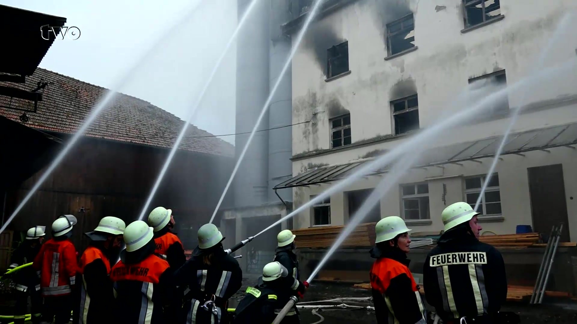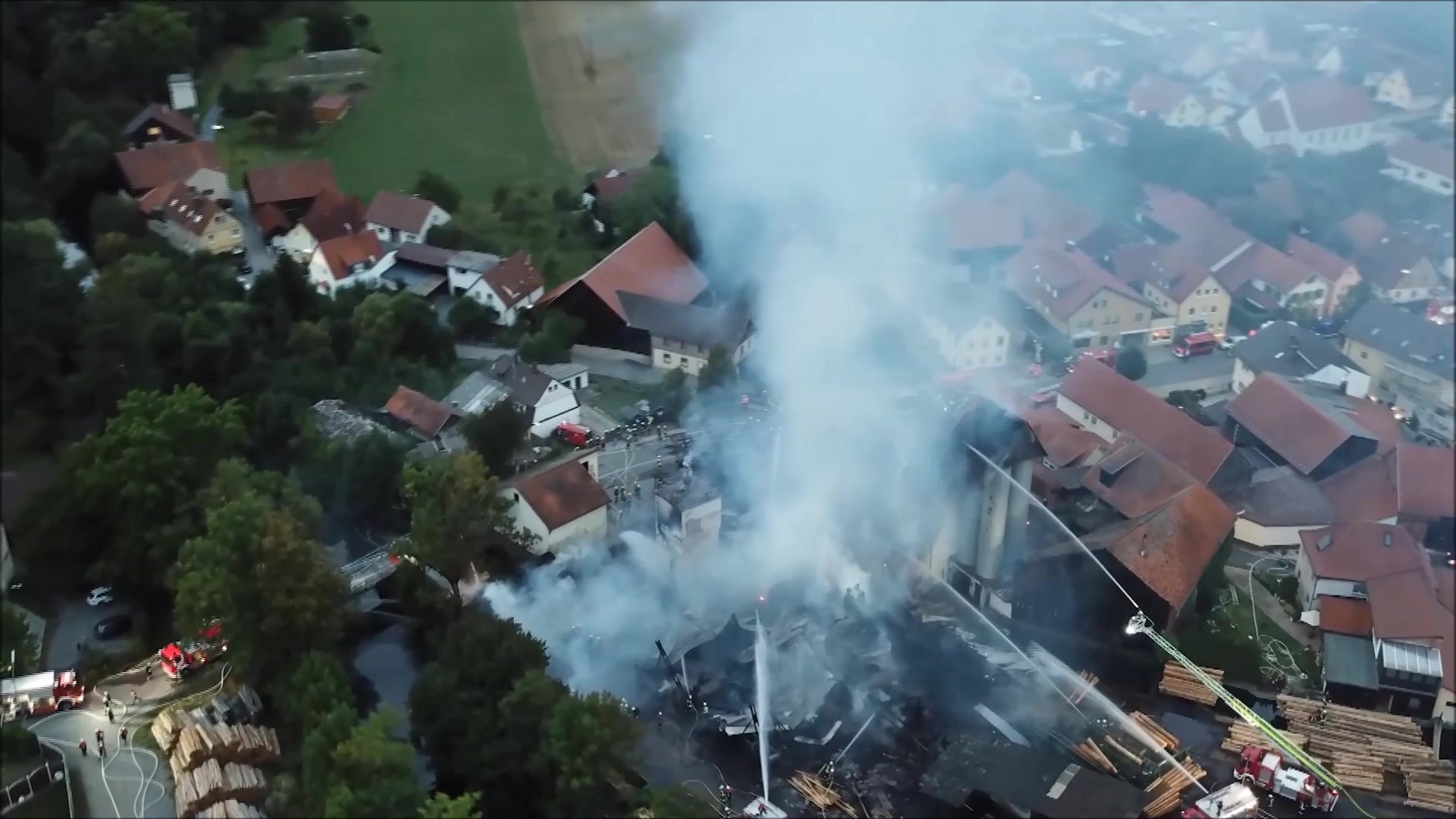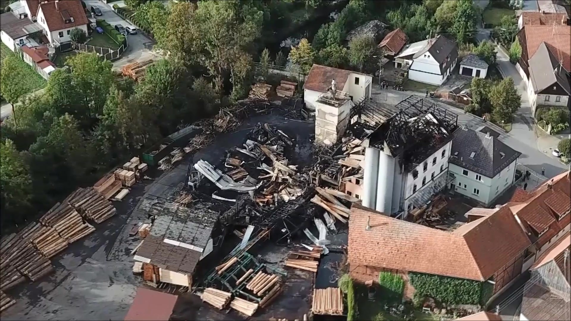 Drohenaufnahmen vom gestrigen Montagabend zeigen die Löscharbeiten der zahlreichen Einsatzkräfte. Weitere Bilder aus der Luft, aufgenommen am Dienstagmorgen, zeigen die Zerstörung, die das Feuer in dem Sägewerk in Höfles anrichtete. Zudem gibt es noch ein Statement von der Feuerwehr. Der Sachschaden wird derzeit auf eine hohe sechsstellige Summe geschätzt.