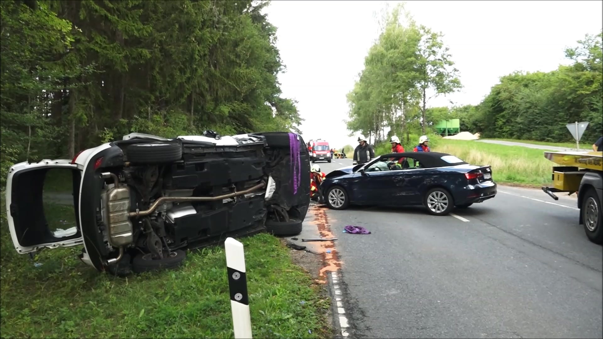 Nach ersten Informationen von vor Ort kam ein Mazda aus Richtung Kichenbirkig und wollte an der Abzweigung zum Kletterwald abbiegen. Dabei übersah die Fahrerin (47) einen entgegenkommenden Audi. Dieser rammte das Familienfahrzeug auf der Beifahrerseite, welches sich in der Folge überschlug und auf der Fahrerseite liegenblieb. Alle fünf Insassen, die Großeltern, die Mutter und die zwei Kinder erlitten schwere Verletzungen. Die Großmutter und das jüngste Kind kamen per Rettungshubschrauber in ein Krankenhaus. Die restlichen Schwerverletzten wurden nach der Erstversorgung mit einem Rettungswagen in Krankenhäuser transportiert. Die Fahrerin des Audi erlitt leichte Verletzungen.