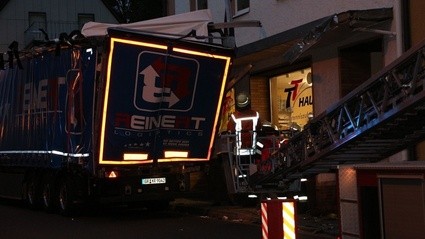 Am Freitagabend (30. September) kurz vor 18:00 Uhr verschätzte sich der Fahrer eines LKW mit Sattelauflieger in Gefrees gewaltig. Er blieb mit seinem Gefährt letztendlich am Vordach eines Hauses hängen.