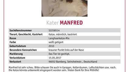 Kater Manfred ist seit dem 15. Mai 2017 spurlos verschwunden. Der Langhaar-Mix wurde zuletzt in der Seinsheimstraße in Bamberg gesehen. Der Kater wird von seinem Ziersohn und seinen Haltern schmerzlich vermisst. Vor allem die Tochter der Familie ist unsagbar traurig über Manfreds Verschwinden.