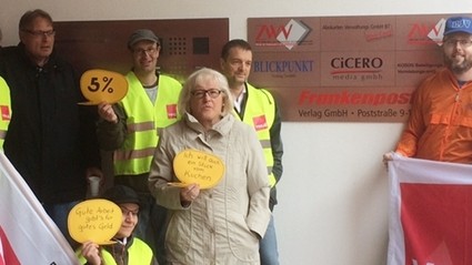 Seit Donnerstagmorgen (19. Mai) um 6:00 Uhr wird beim Verlag und der Druckerei der Frankenpost mit Sitz in Hof für 24 Stunden gestreikt. Beim angegliederten Tochterunternehmen HCS Content GmbH legen die Beschäftigten aus Solidarität ebenfalls ihre Arbeit nieder, allerdings nur für acht Stunden, beginnend um 14:00 Uhr.
