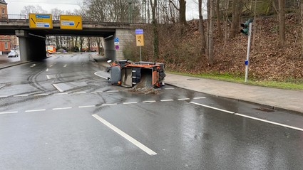 Nach bisherigen Erkenntnissen der Polizei könnte der Unfall auf eine überhöhte Beladung und nicht angepasste Geschwindigkeit beim Abbiegen zurückzuführen sein. Die genauen Hintergründe werden derzeit ermittelt.