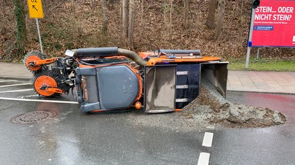 Kurz vor 14 Uhr war der 52-jährige Fahrer mit seiner Kehrmaschine auf der Ossecker Straße in Richtung Bahnhofstraße unterwegs. Als er in den Kreuzungsbereich am Q-Bogen einfuhr und dabei nach links in Richtung Bahnhofstraße abbiegen wollte, kam sein mit Streukies beladenes Fahrzeug heftig ins Schlingern. Dabei kippte die Maschine um und blieb mit der linken Seite auf der Fahrbahn liegen.