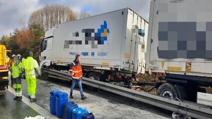 Daraufhin walzte der Lkw rund 40 Meter Leitplanke nieder. Teile der Schutzplanke bohrten sich in die Zugmaschine. Dabei riss auch der 1000 Liter fassende Kraftstofftank auf, weshalb mehrere Hundert Liter Diesel ins Erdreich flossen. Die Feuerwehr pumpte einen Teil des Diesels ab.
