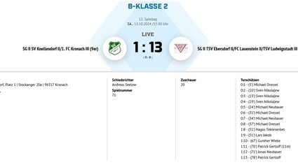 In einem Spiel, das an ein Tischtennis-Match erinnerte, kassierte Knellendorf / Kronach eine fast schon historische 1:13-Klatsche gegen die Tor-Maschinen aus Ebersdorf / Lauenstein / Ludwigsstadt. Schon nach drei Minuten klingelte es durch Michael Dressel im Kasten, und die Gäste legten munter nach. Sven Nikolajew, ebenfalls bestens in Schusslaune, machte innerhalb von neun Minuten direkt einen Hattrick klar. Michael Neubauer dachte sich: „Nicht ohne mich!“ und trug sich gleich zweimal in die Torschützenliste ein. Zur Halbzeit zeigte die Anzeigetafel ein bescheidenes 0:8 – und die Frage lautete: „Was machen wir hier eigentlich?“. Knellendorf erzielte in der 51. Minute immerhin den Ehrentreffer durch Hagos Teklesenbet, aber die Gäste konterten mit einem Endspurt von fünf weiteren Treffern, bei dem Patrick Gertloff gleich doppelt netzte. Fazit: Knellendorf spielte mit, aber die Tore machten die anderen!