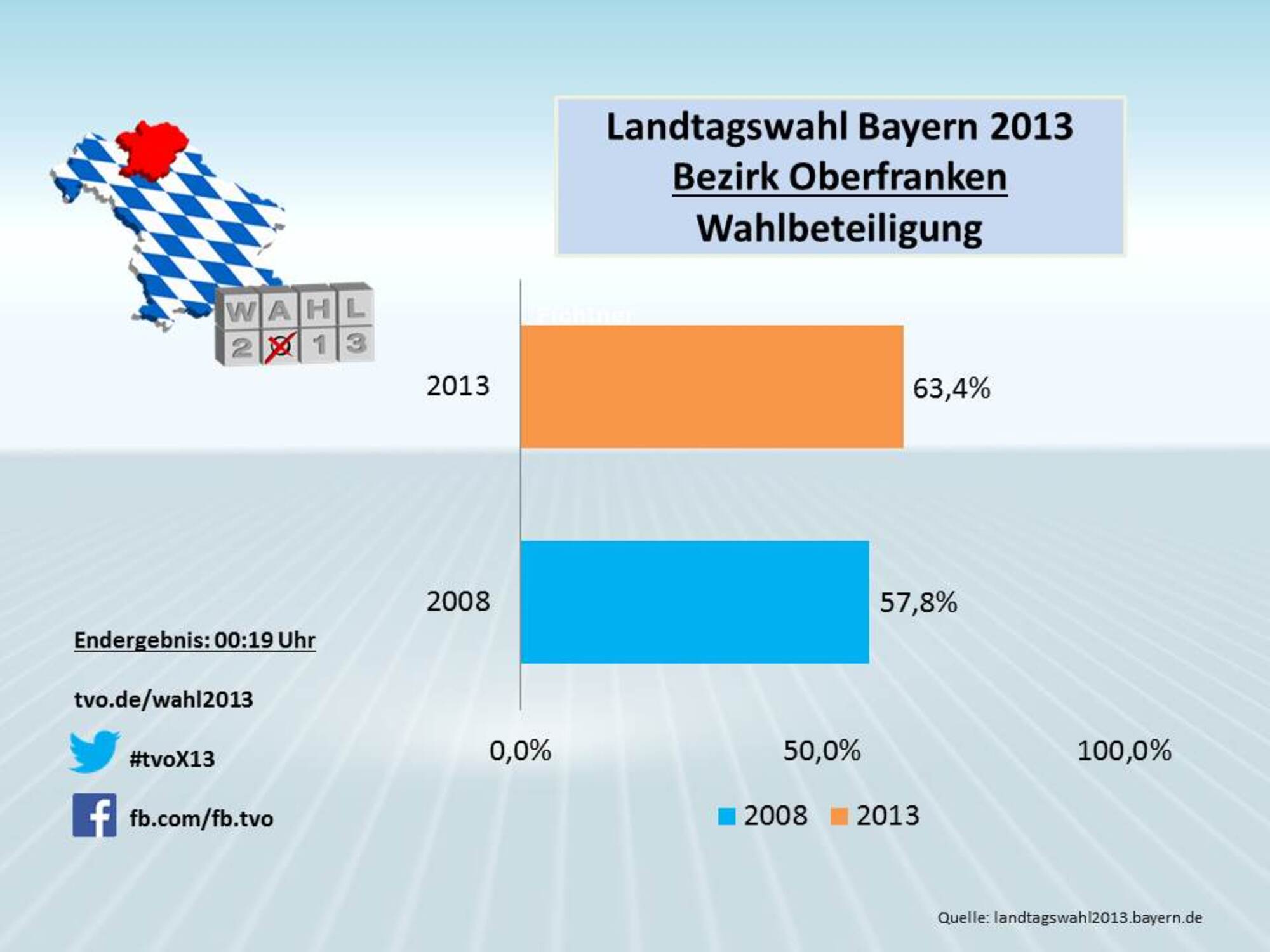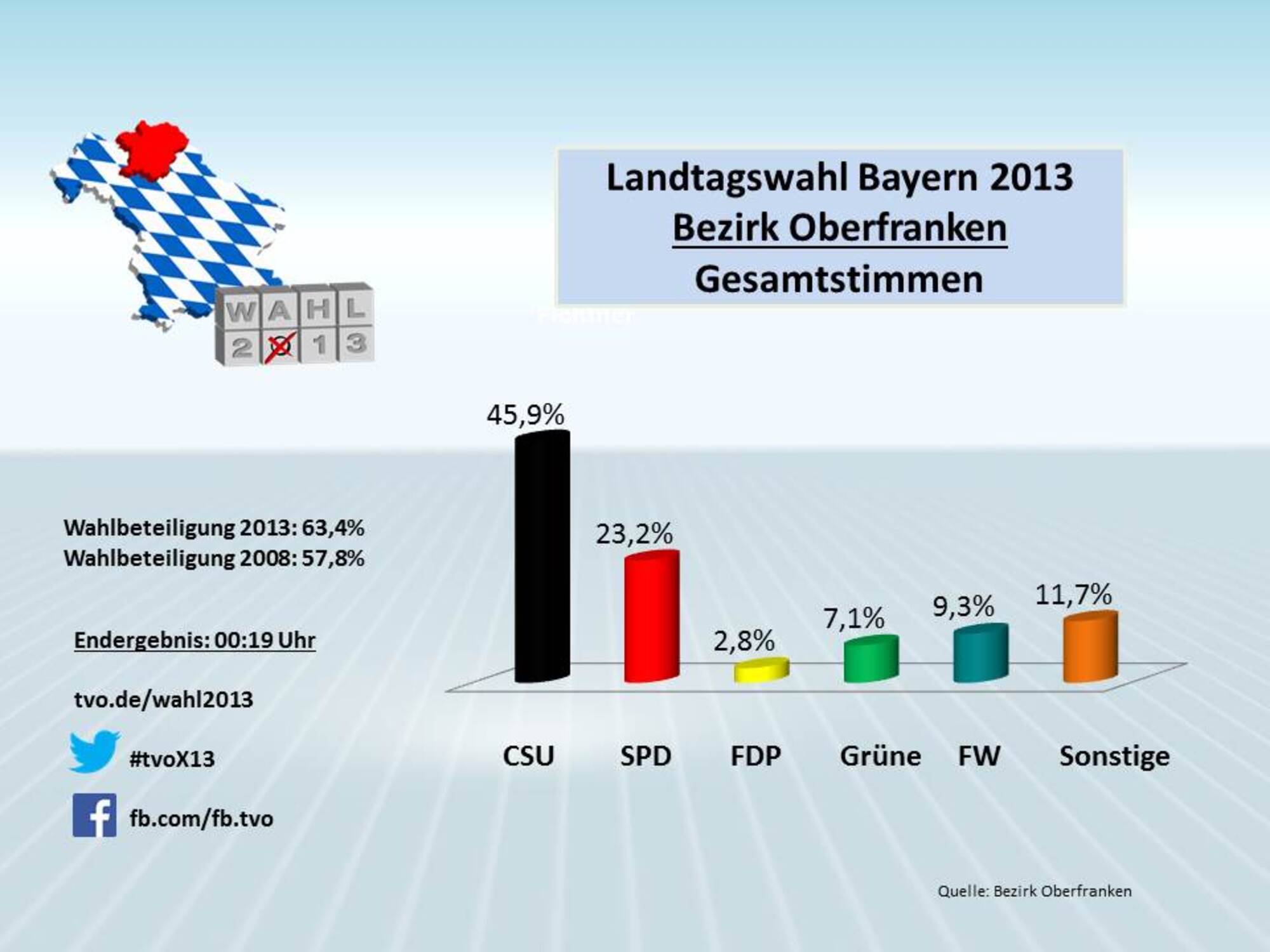 In Oberfranken treten am Sonntag (14. Oktober) 14 Parteien und Wählergruppen an. Insgesamt bewerben sich oberfrankenweit 174 Kandidatinnen und Kandidaten um einen Sitz im Bayerischen Landtag. Rund 840.000 oberfränkische Stimmberechtigte können am Sonntag zwischen 08:00 Uhr und 18:00 Uhr in den Wahllokalen ihre Stimmen abgeben. Darunter sind rund 56.000 Erstwähler.