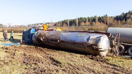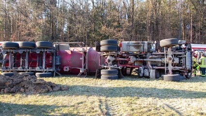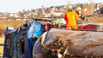 Der 22-jährige Fahrer eines Sattelzuges war mit seinem Gefährt in einer 90-Grad-Kurve bei Neuses am Brand von der Fahrbahn abgekommen. Dabei überschlug sich das mit Gülle beladene Gespann und blieb schließlich im angrenzenden Acker auf der Beifahrerseite liegen. Das Fahrerhaus deformierte sich derart, dass der Fahrer eingeklemmt wurde und durch die Hilfskräfte aus seiner Zugmaschine befreit werden musste. Der junge Mann erlitt mittelschwere Verletzungen und wurde in einem Krankenhaus versorgt.