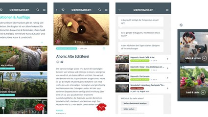 Die kostenlose Oberfranken-App bietet kompakte Informationen, viel Service und hilfreiche Mehrwertverknüpfungen. Kurze Filme stellen Besonderheiten der Region emotional heraus – spannend sowohl für Oberfranken als auch Touristen jeden Alters. Auf Wunsch navigiert ein digitaler Assistent durch das Angebot, der dem Nutzer standort- und tageszeitbezogene Vorschläge unterbreitet. Die App ist die eine Plattform, die das gesamte Oberfranken auf digitalem Weg verbindet.