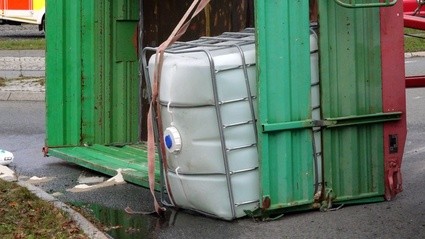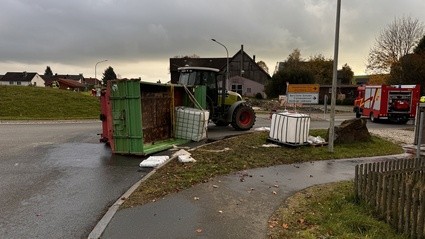 Wie die Polizei in einer ersten Meldung mitteilte, stürzte Mittwochnachmittag (30. Oktober) im Kreisverkehr von Konradsreuther Gemeindeteil Reuthlas im Landkreis Hof ein Anhänger, beladen mit Intermediate Bulk Container (kurz: IBC) um. In diesen IBC befand sich Flüssigdünger, welche durch den Unfall ausgetreten ist.