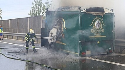 Der Fahrer eines Bier-Lkw bemerkte rund 600 Meter vor der Anschlussstelle Roßdorf am Berg (Landkreis Bamberg) Rauch aufsteigen und stellte seinen Truck auf dem Standstreifen ab. Als er die Flammen bemerkte, koppelte er die Zugmaschine vom Anhänger ab und brachte diese in Sicherheit. Im Anschluss versuchte er die Flammen am Anhänger selbst unter Kontrolle zu bringen, was ihm jedoch nicht mehr gelang.