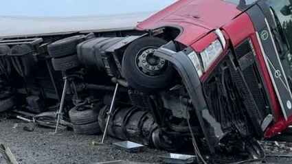 Am Samstag (02. Januar), gegen 11:15 Uhr, befuhr ein Sattelzug aus Polen den rechten Fahrstreifen. Vermutlich aufgrund eines Reifenplatzers, auf der linken Seite der Zugmaschine, verlor der 40-jährige Fahrer aus Russland die Kontrolle über sein Fahrzeug. Der Sattelzug brach nach links aus und durchschlug die verstärkte Mittelschutzplanke. Der Sattelzug kippte auf die linke Seite und kam auf der Schutzplanke zum Liegen. Der Aufbau des Aufliegers wurde durch die Ladung aufgerissen. Die gesamte Ladung verteilte sich auf der Gegenfahrbahn.