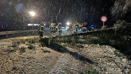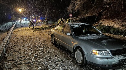 Gegen Mitternacht war ein 45-jähriger Audi-Fahrer auf der B26 im Bereich des Ortsteils Trosdorf unterwegs. Auf freier Strecke prallte er gegen einen durch den Schneefall quer auf der Straße liegenden Baum. Der Unfallverursacher blieb unverletzt. Der Schaden betrug rund 4.000 Euro. Die alarmierte Feuerwehr kümmerte sich um die Beseitigung des Baumes.